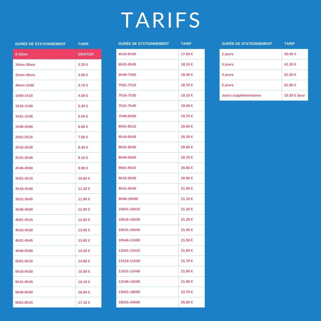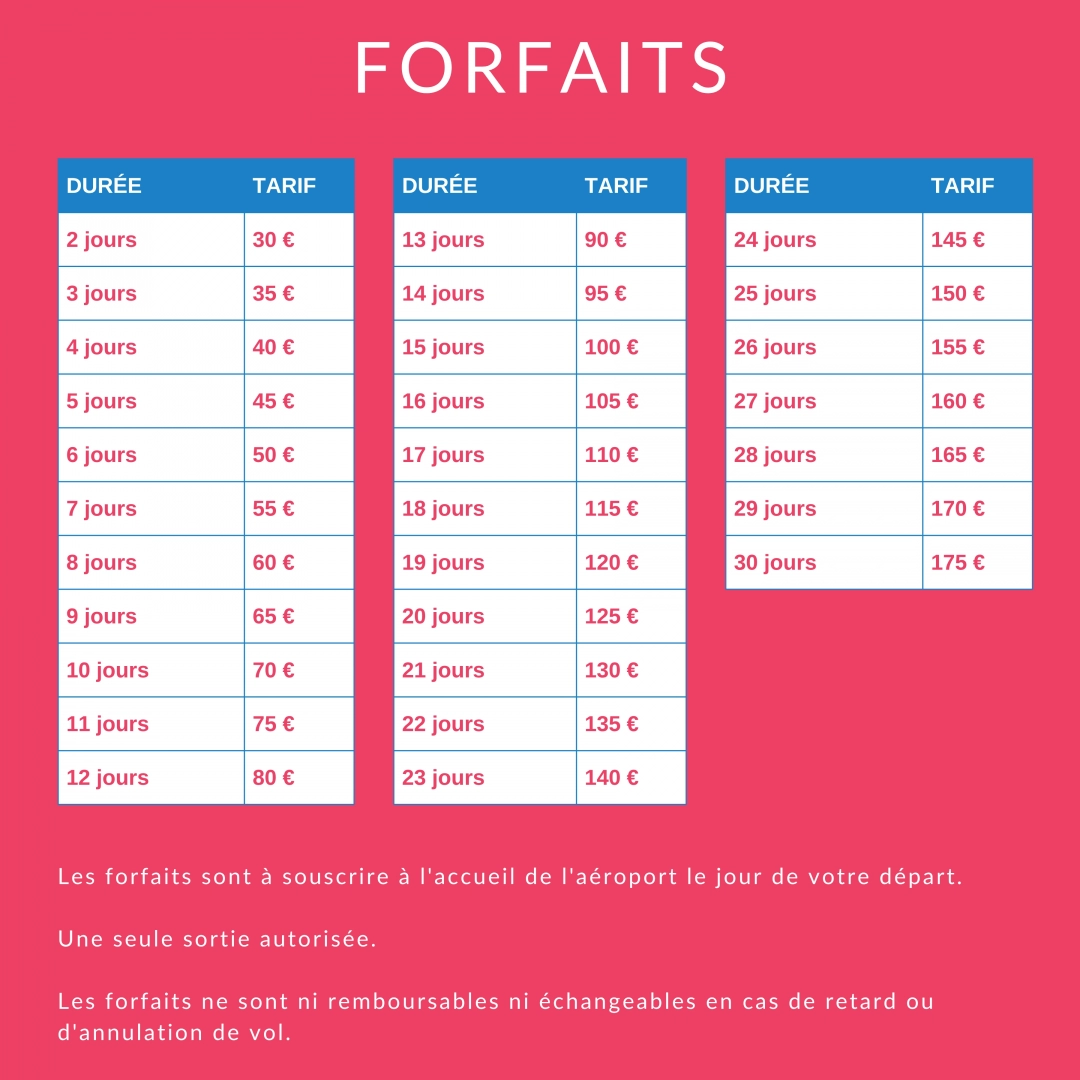 A package only allows one entry and one exit. Exceeding one minute of the hourly or daily slots results in moving to the upper bracket. Parking is done at the risk and peril of the users. The fees collected are only parking fees. The airport declines all responsibility in the event of damage, theft or accident. Packages are neither refundable nor exchangeable.